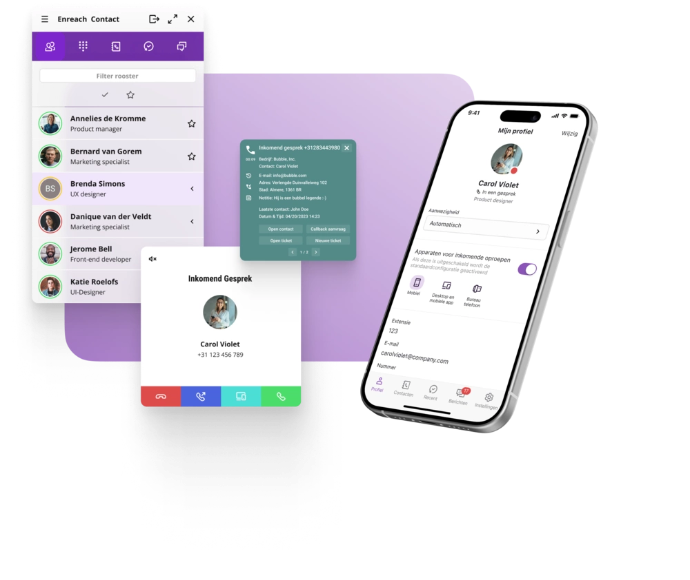 Het complete Enreach Contact platform voor al je communicatie. Softphone voor op je desktop, mobiele app voor onderweg, en naadloze integratie met Microsoft Teams. Gesprekken, gespreksgeschiedenis en contacten zijn altijd gesynchroniseerd over al je apparaten.